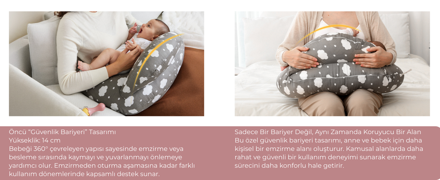 Emzirme ve biberonla besleme sırasında anne ve bebeğe dengeli destek sunar, omuz ve boyun yükünü azaltmaya yardımcı olur.Güvenlik Bariyeri Tasarımı